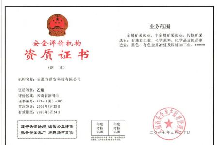 2003年11月10日,昭通市鼎安科技有限公司成立,初始主要從事第三方安全工程技術(shù)服務(wù),經(jīng)多年運(yùn)營,發(fā)展為多專業(yè)綜合科技平臺,為社會提供多種專業(yè)技術(shù)服務(wù)工作。 現(xiàn)公司注冊資金為1200萬元,公司法定代表人:毛衛(wèi)旭。公司主要業(yè)務(wù):安全評價、安全標(biāo)準(zhǔn)化評審、安全工程技術(shù)服務(wù);環(huán)境監(jiān)測、職業(yè)衛(wèi)生檢測、檢驗;法律訴訟及非訴訟服務(wù);司法鑒定、固定資產(chǎn)投資項目節(jié)能服務(wù);工程咨詢;工程測量測繪;安全教育培訓(xùn)等。是安全生產(chǎn)服務(wù)、安全教育培訓(xùn)機(jī)構(gòu),也是環(huán)境監(jiān)測和職業(yè)衛(wèi)生服務(wù)機(jī)構(gòu),同時也是綜合的檢測檢驗、綜合科技平臺服務(wù)機(jī)構(gòu)。多年來為公、檢、法、司、軍、警、海關(guān)、仲裁、安監(jiān)、工礦商貿(mào)企業(yè)、社會團(tuán)體及個人提供多專業(yè)技術(shù)服務(wù)。